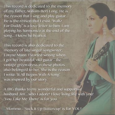 Mary Elizabeth Long knows a little about the entertainment industry. She was an award winning makeup artist, wardrobe stylist and jewelry designer. When her father was diagnosed with dementia in 2014, Mary Elizabeth's life changed when she became his full time caregiver. That's when the music started. Her father had played harmonica his whole life. Although his short term memory was failing, he could still remember how to play hundreds of classic country songs. Mary Elizabeth realized the true power of music! She learned to play guitar so the two of them could share the gift of song. She purchased a vintage guitar and the very next day she wrote her first country song. The last song on her record is a love letter to her father 'Waltz For Daddy'.